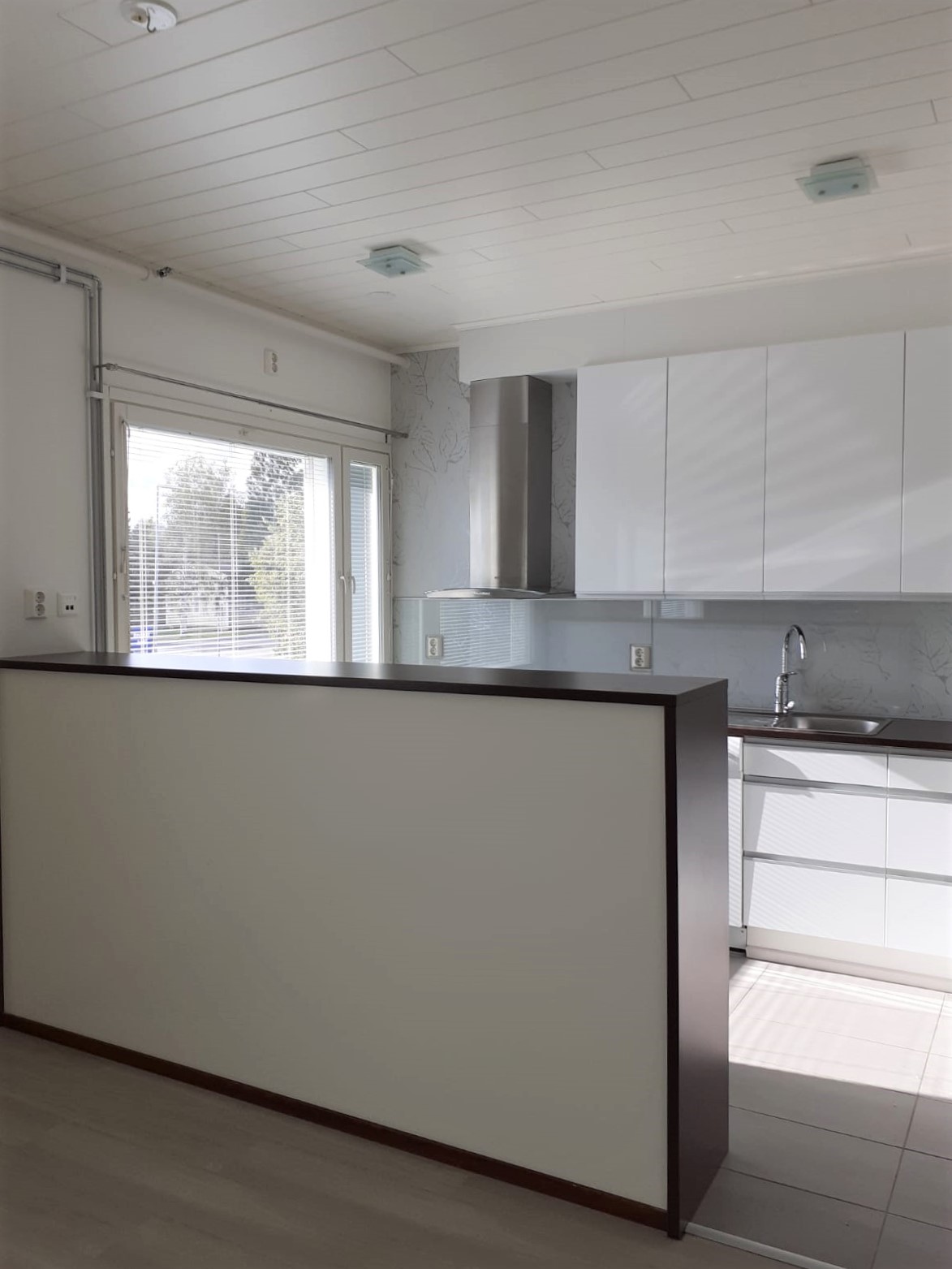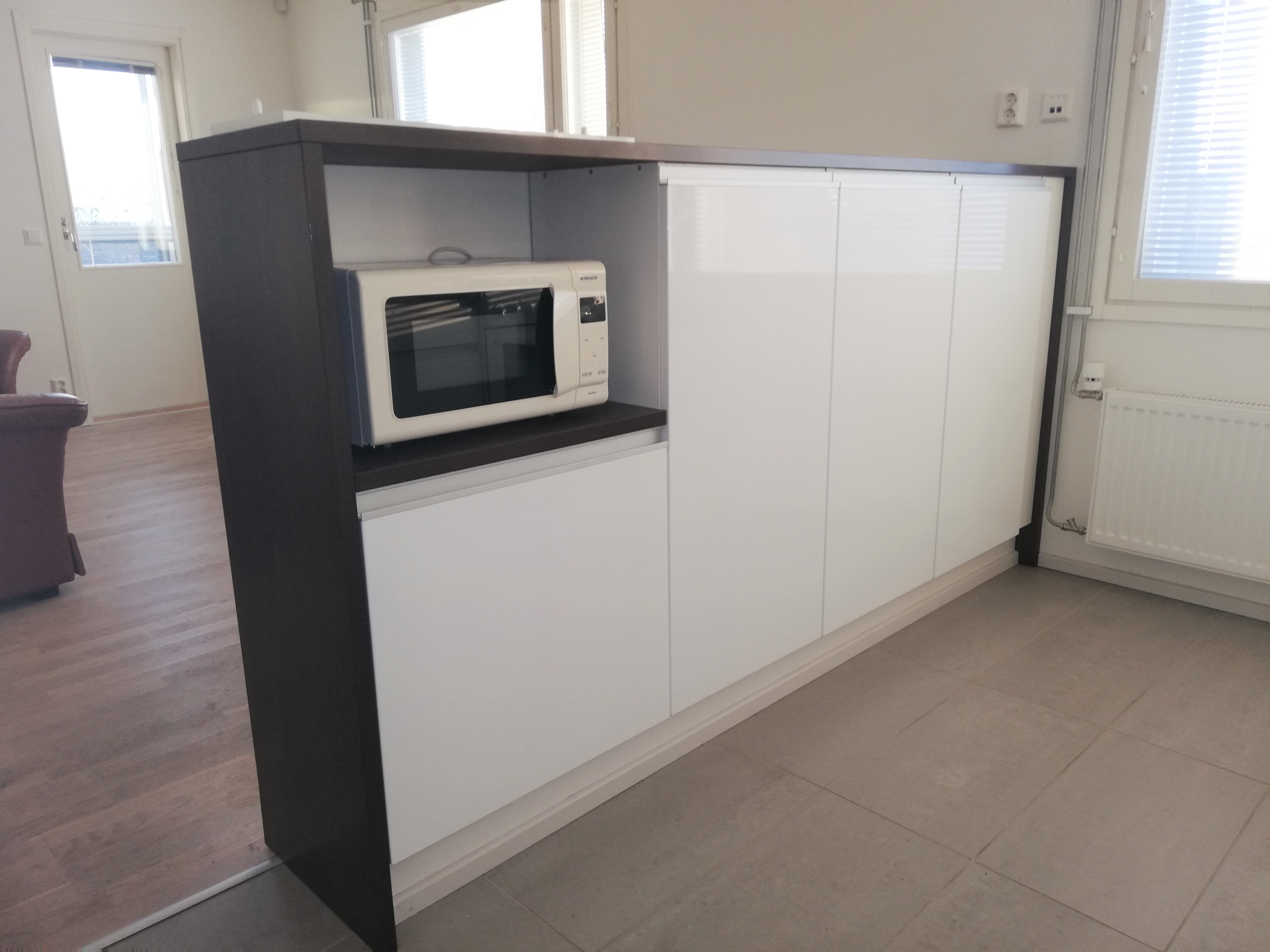Keittiöosa on erotettu olohuoneesta kaapillisella seinäkkeellä.