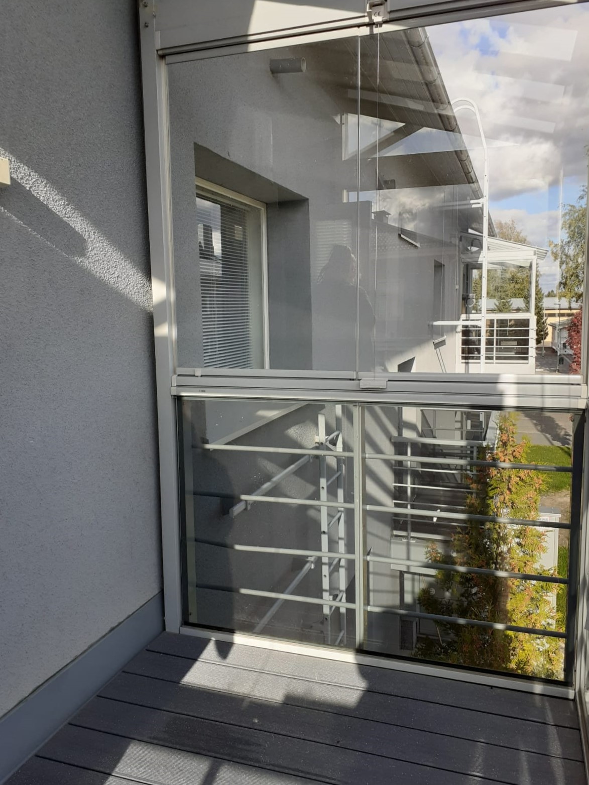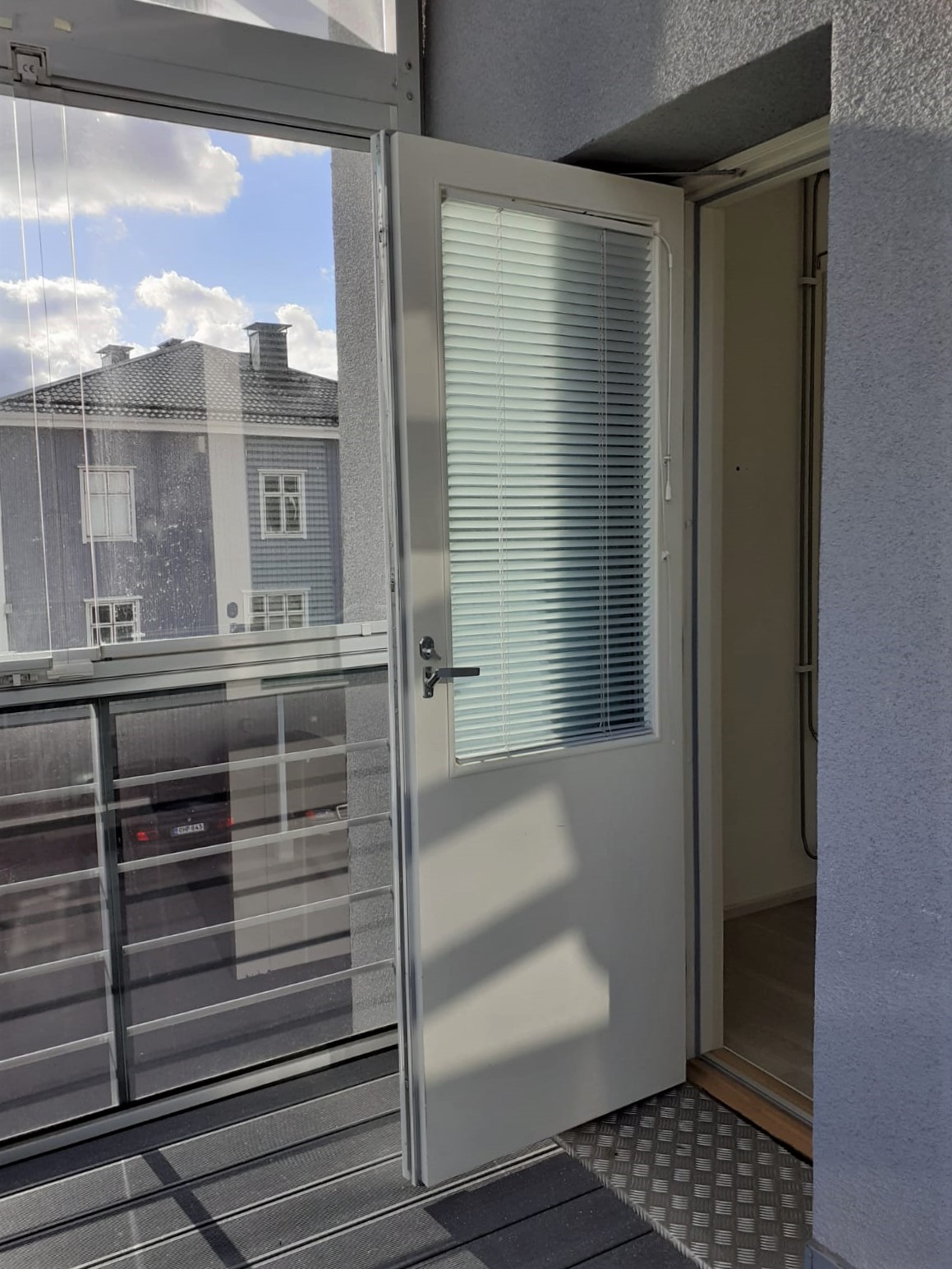 Keittiön ja makuuhuoneen ikkunat ovat Säästöpankki-sanan alapuolella, parvekkeen taakse jää makuuhuoneen ikkuna.